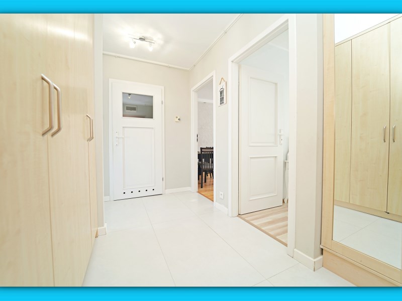 WNĘTRZE MIESZKANIA: Mieszkanie dwustronnie rozkładowe, ciepłe i słoneczne, wystawa okienna płn.wschód – płd.zachód z widokiem na sąsiednie budynki. Ściany wygładzone, utrzymane w jasnej kolorysty, drzwi wewnętrzne w kolorze białym, wszystkie okna PCV. W salonie oraz sypialniach na podłogach panele, w kuchni oraz przedpokoju jasny gress, w łazience glazura i terakota nowego typu. Wnętrze zadbane, nie nosi znamion nadmiernego użytkowania, może wymagać jedynie odświeżenia.