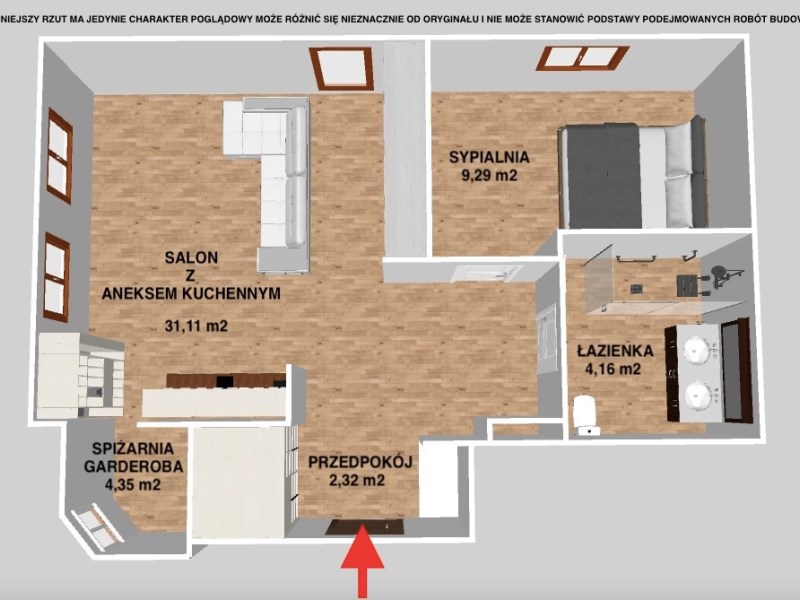 POTENCJAŁ ARANŻACYJNY: Opisany lokal mieszkalny posiada duży potencjał aranżacyjny, który pozwala dostosować wnętrze do indywidualnych potrzeb przyszłego nabywcy tzn. istnieje także możliwość łatwej i szybkiej aranżacji dwóch oddzielnych pokoi i oddzielnej kuchni. Wystarczy wykonać lekką ściankę konstrukcyjną w systemie GK aby wyodrębnić dodatkowy oddzielny pokój jednocześnie pozostawiając otwartą na przedpokój kuchnię lub również ją wyodrębnić, oddzielając od przedpokoju ścianką konstrukcyjną GK.